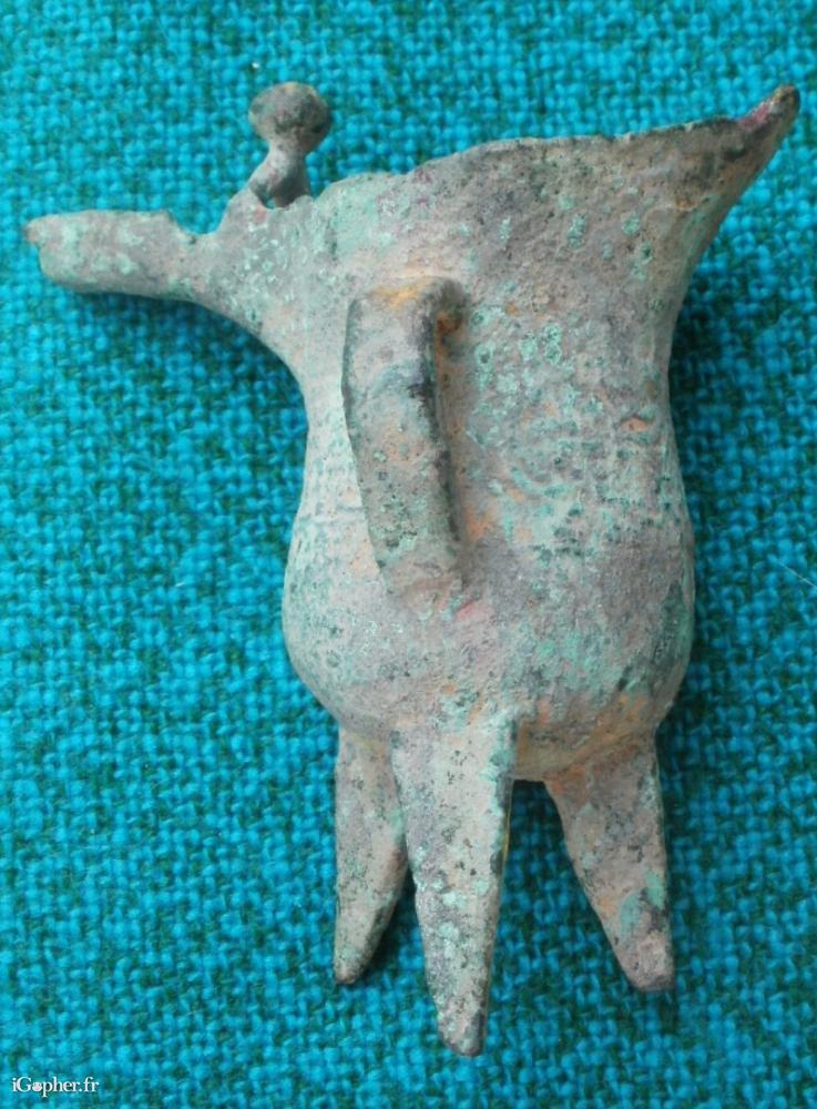 Un petit vase chinois à vin appelé "JUE", à 3 pieds avec une anse.