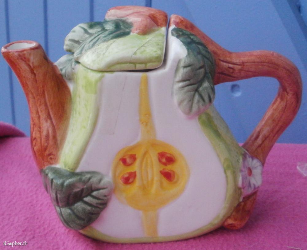 Une petite théière en forme de poire. Un côté représente la poire extérieure, et l'autre côté représente la poire coupée en deux.