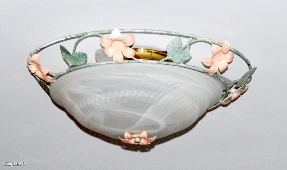 Un joli plafonnier acheté chez KERIA en verre type OPALINE avec des dessins marbrés et un entourage en métal. Décor vert et saumon représentant des motifs fleuris.