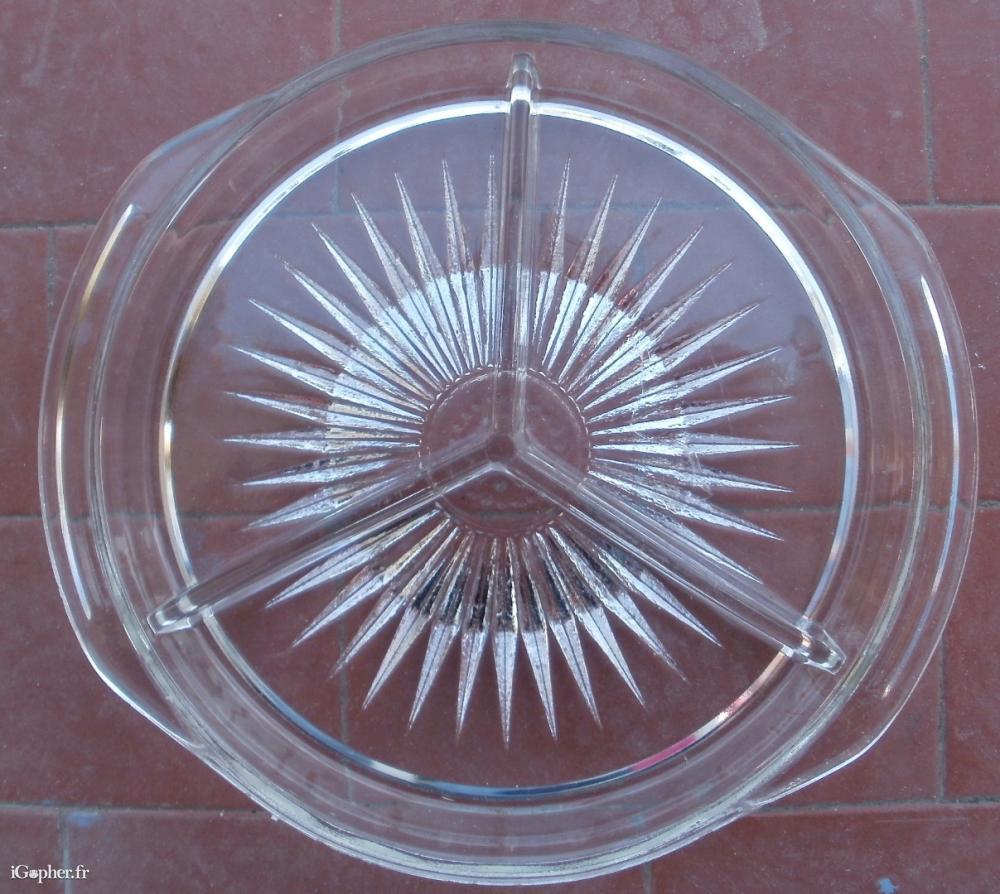 Un plat apéritif en verre, composé de trois compartiments non détachable.