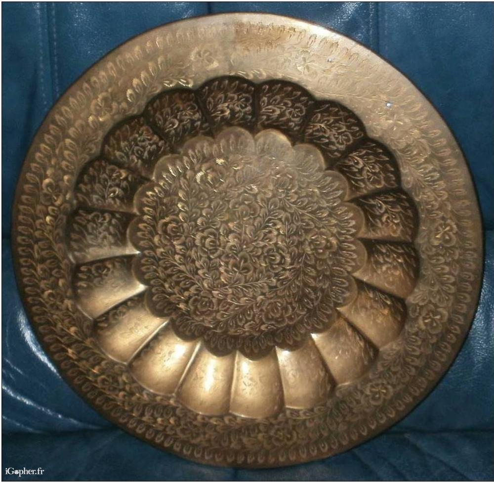 Un plateau artisanal, en cuivre, pouvant s'accrocher. Il est entièrement ciselé. Le travail réalisé dessus est très régulier.
