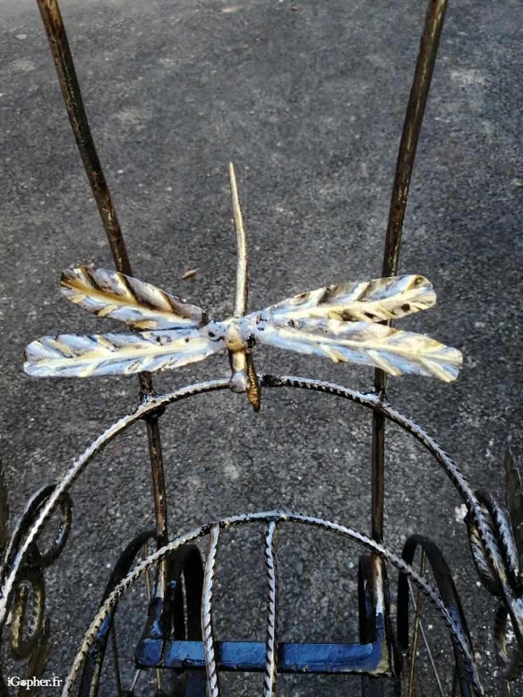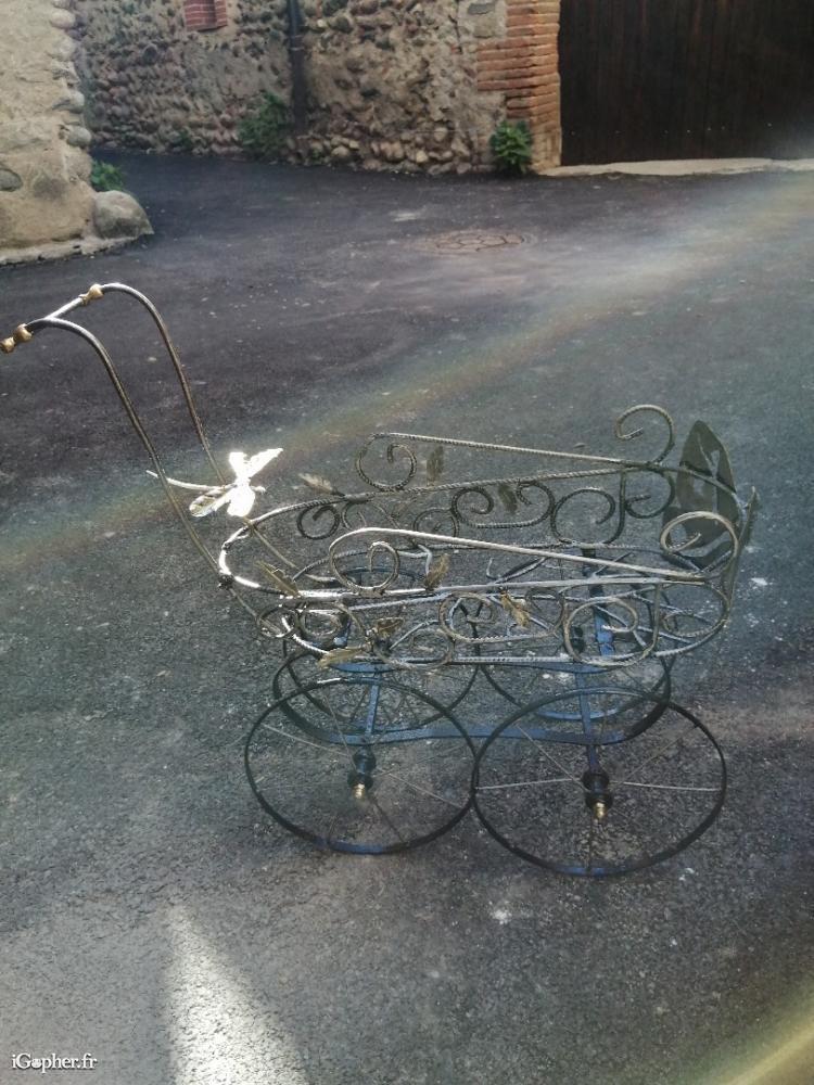 Poussette décoration sculptée, pièce unique. c'est un chasis de poussette de 1932. Toute la carcasse est forgée et sculptée de petits insectes. Voir photo. Pour deco jardin, ou autre. Vous ne la trouverez nul par ailleurs car elle est unique. Pièce d art, le prix justifie le travail passé dessus.