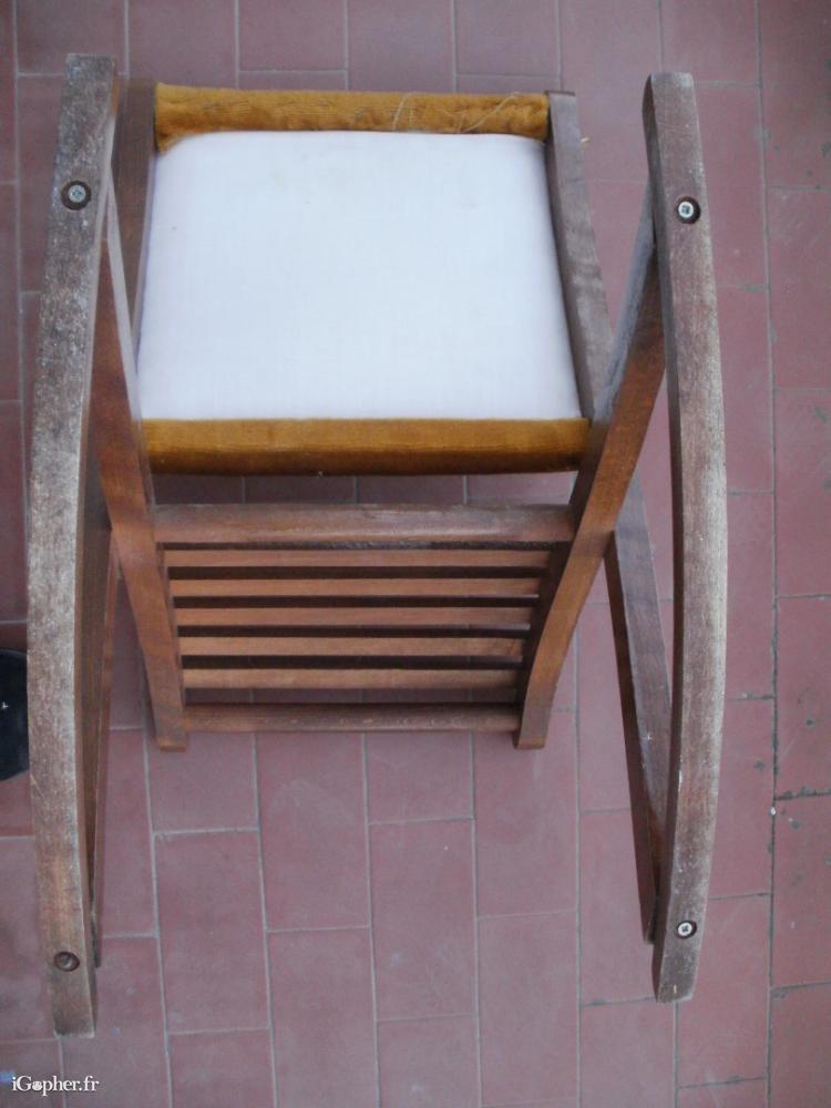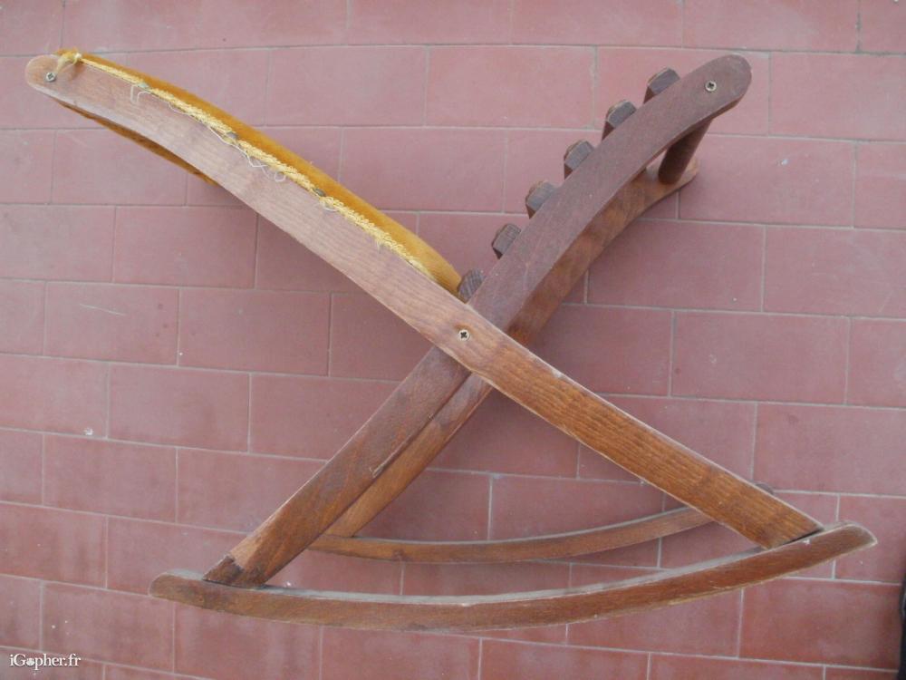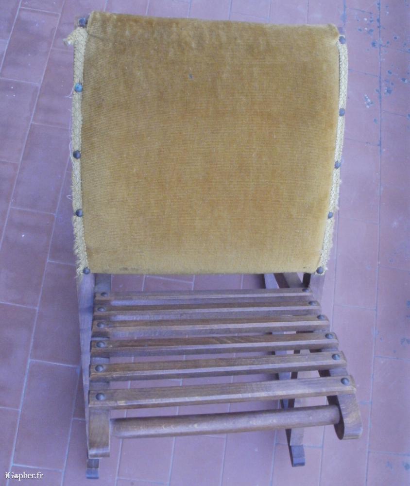 Un repose pied balancelle, en bois foncé, recouvert avec du velours de couleur ocre pour reposer les jambes.
