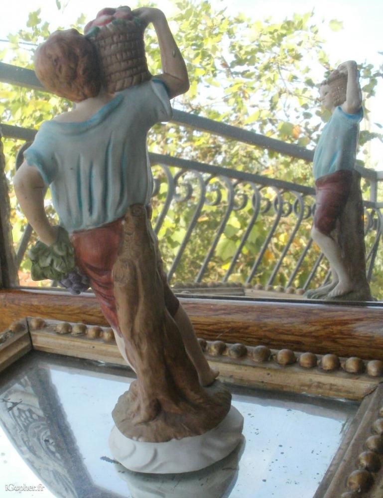 Une statuette en biscuit, représentant un jeune homme portant un panier sur l'épaule.