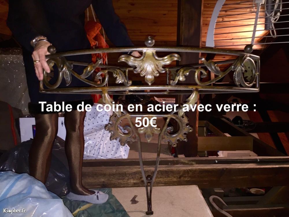Table de coin en acier avec plateau en verre.