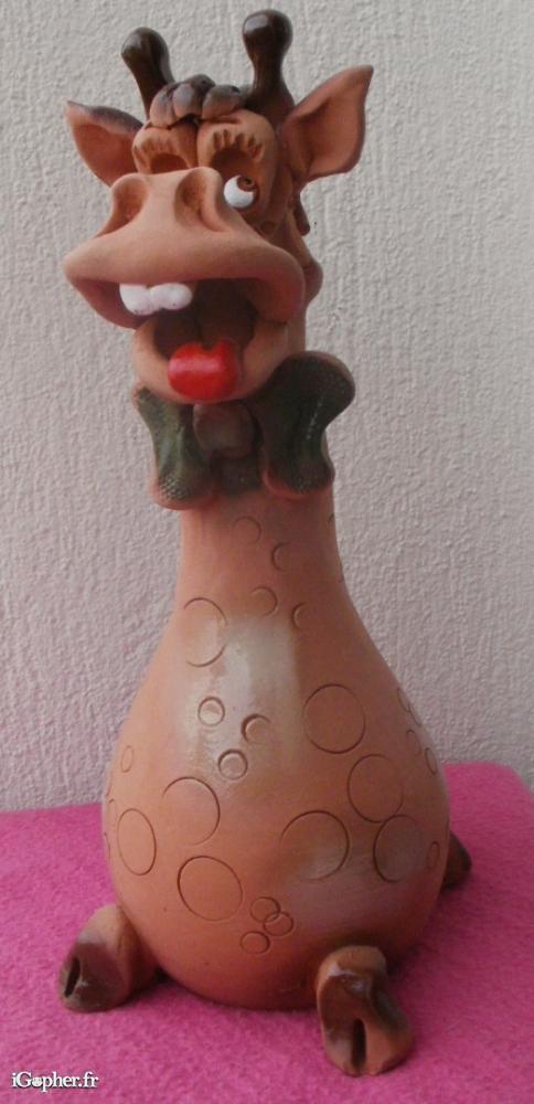 Poterie en argile ou terre cuite, servant de tirelire. Elle représente une vache avec le regard au ciel, et passe la langue. Objet de décoratuon utile humoristique.