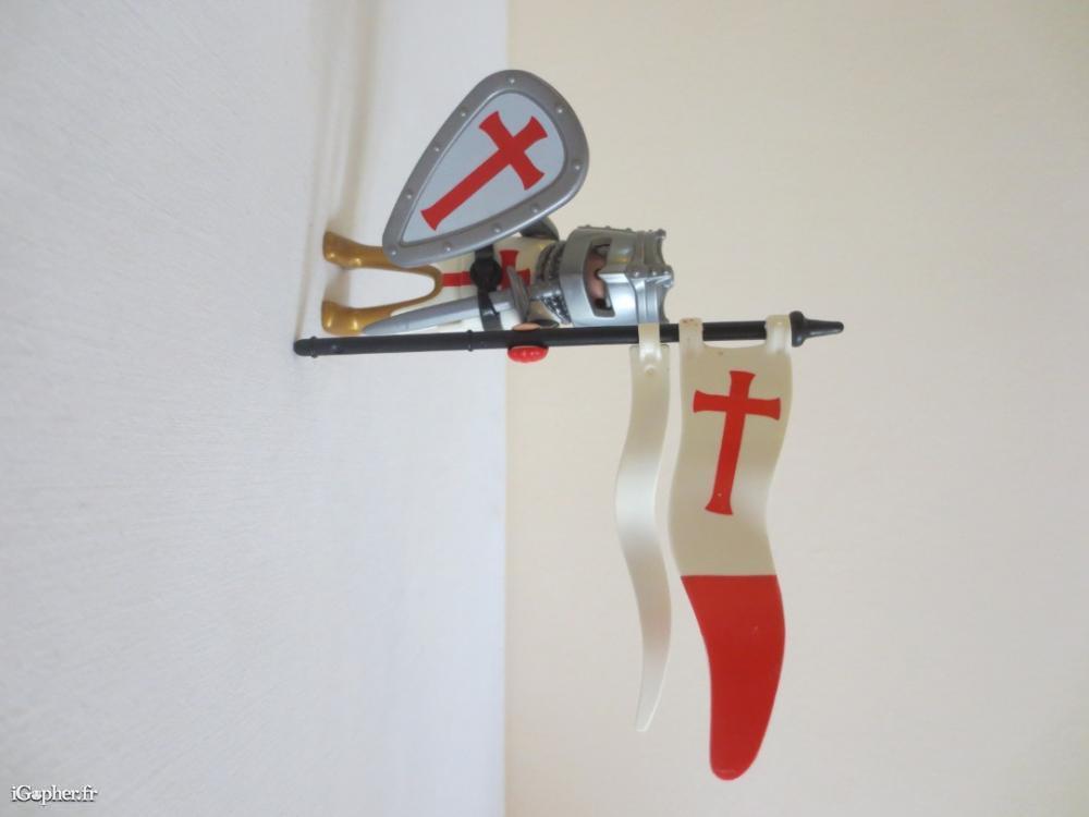 Figurine templiers Playmobil avec ses accessoires : Heaume, épée, drapeau, bouclier et gants.