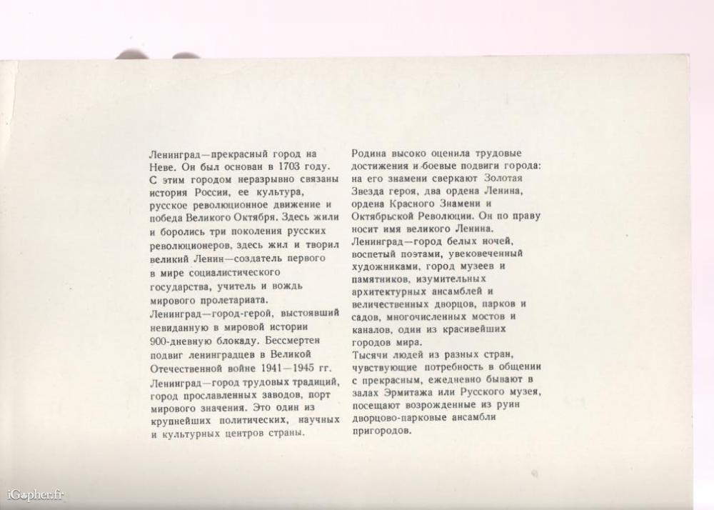 Il s'agit d'une pochette sur LENINGRAD. Elle comprend 28 grandes photos (format 25 cm x 17 cm). J'apparente ces photos à une très grande carte postale. Photos sur les monuments et autres. Textes en russe.