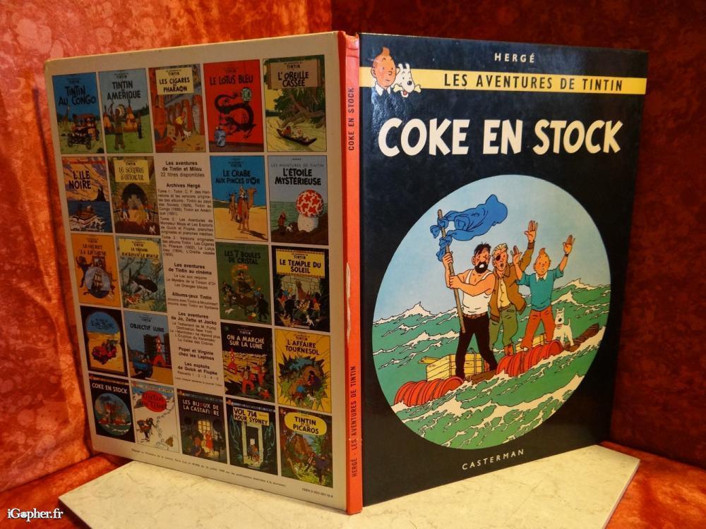 Bande dessinée d'occasion : Tintin Coke en Stock. Tome 19. Imprimé en Belgique juin 1980. Grand format 30.5x23 cm. Date de parution 1958. Éditeur Casterman.