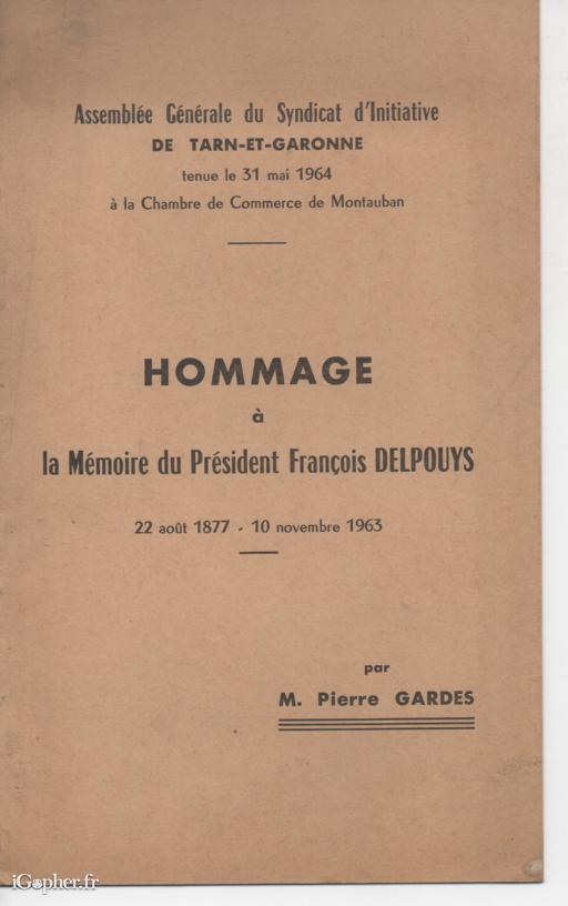 Un livre édité par l'Assemblée Générale du Syndicat d'Initiative de TARN ET GARONNE, tenue le 31 mai 1964 à la Chambre de Commerce de Montauban. Il titre : HOMMAGE à la mémoire du Président François DELPOUYS, 22 août 1877 - 10 novembre 1963.