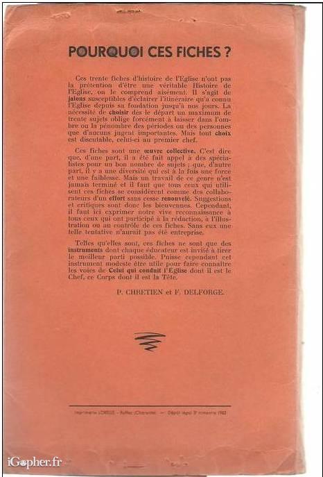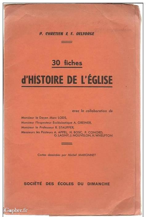Un ouvrage écrit par P. CHRETIEN et F. DELFORGE. Dans une pochette cartonnées, 30 fiches d'Histoire de l'Eglise avec la collaboration de Mr le Doyen Marc LODS, Mr l'Inspecteur Ecclésiastique A. GRENIER, Mr le Professeur R. STAUFFER, Mrs les Pasteurs A. APPEL, H. BOSC, P. CONORD, G. LAGNY, J. NOUVELON, H. WHELPTON.