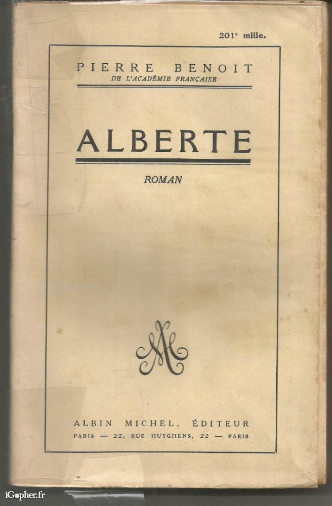 Un livre de 318 pages, écrit par Pierre BENOIT. Il titre "Alberte". Un ouvrage publié aux éditions Albin MICHEL en 1926.