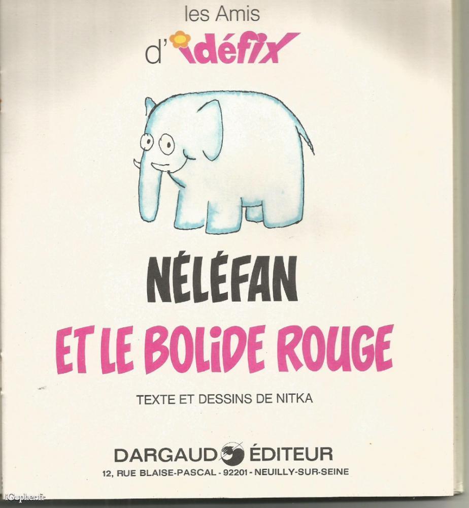 Ouvrage pour la jeunesse de collection "les amis d'Idefix", il titre : "Les amis d'Idéfix : Néléfan et le bolide rouge". Texte et dessins de NITKA. Un livre pour les enfants publié chez DARGAUD Editeur en 1974.