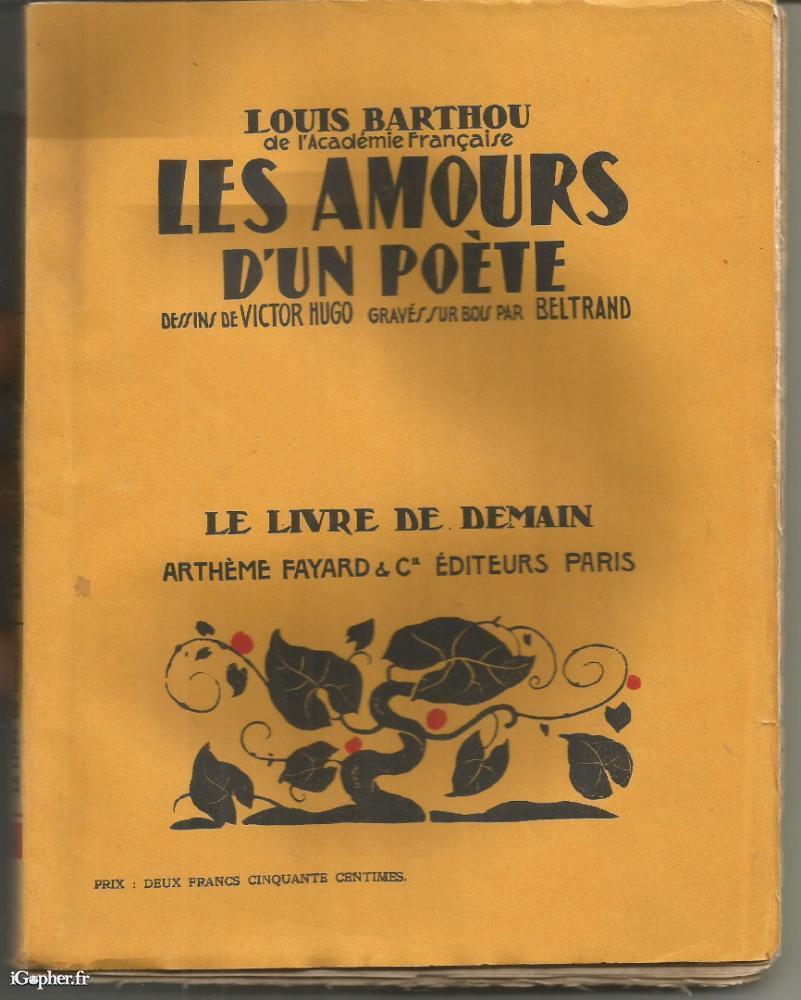 Livre de la Collection "le livre de demain". Il titre "Les amours d'un poète" et a été écrit par Louis BARTHOU. Dessins de Victor Hugo gravés sur bois par Bertrand. Un livre de 126 pages paru aux éditions Arthème Fayard (sans date, probablement vers 1930).