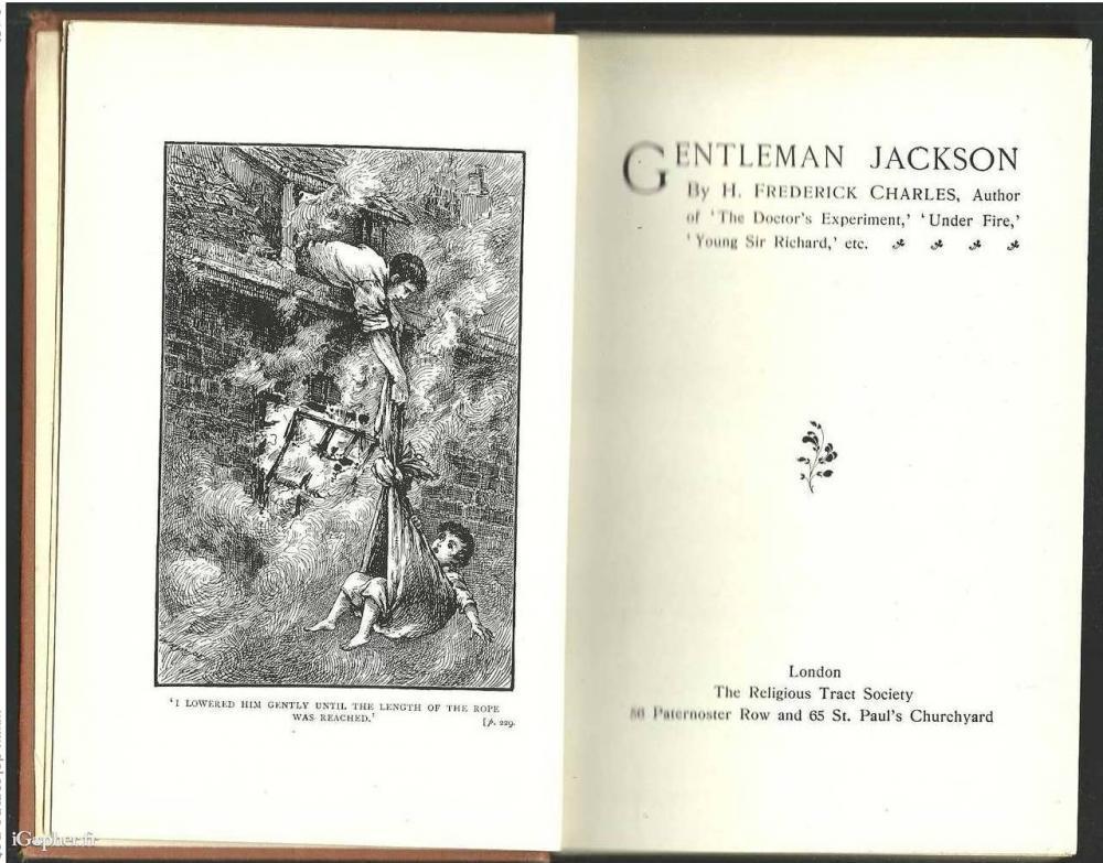 Livre en anglais écrit par H. FREDERICK CHARLES, il titre : Gentleman Jackson. Distribution de prix en 1905. Ouvrage de 288 pages publié chez l'éditeur "The Religious Tract Society" à Londres, Royaume-Uni.