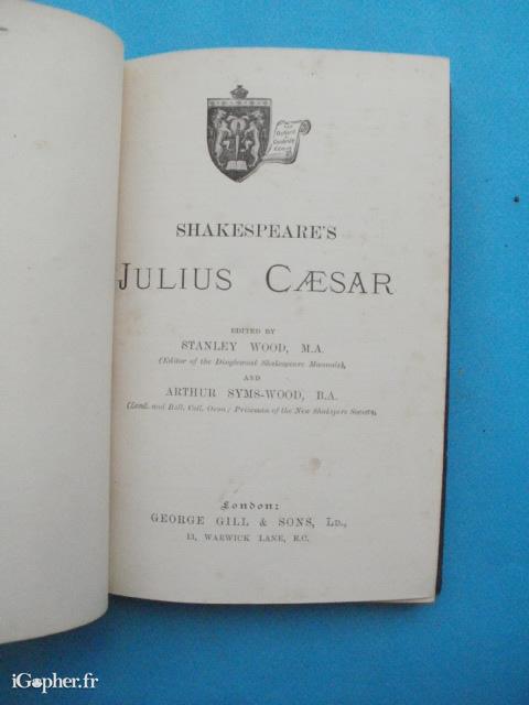 Livre de 180 pages issu de l'établissement "county school for boys de COALBROOKDALE" en Angleterre. Il est écrit en anglais et titre : "SHAKESPEARE'S Julius Caesar".