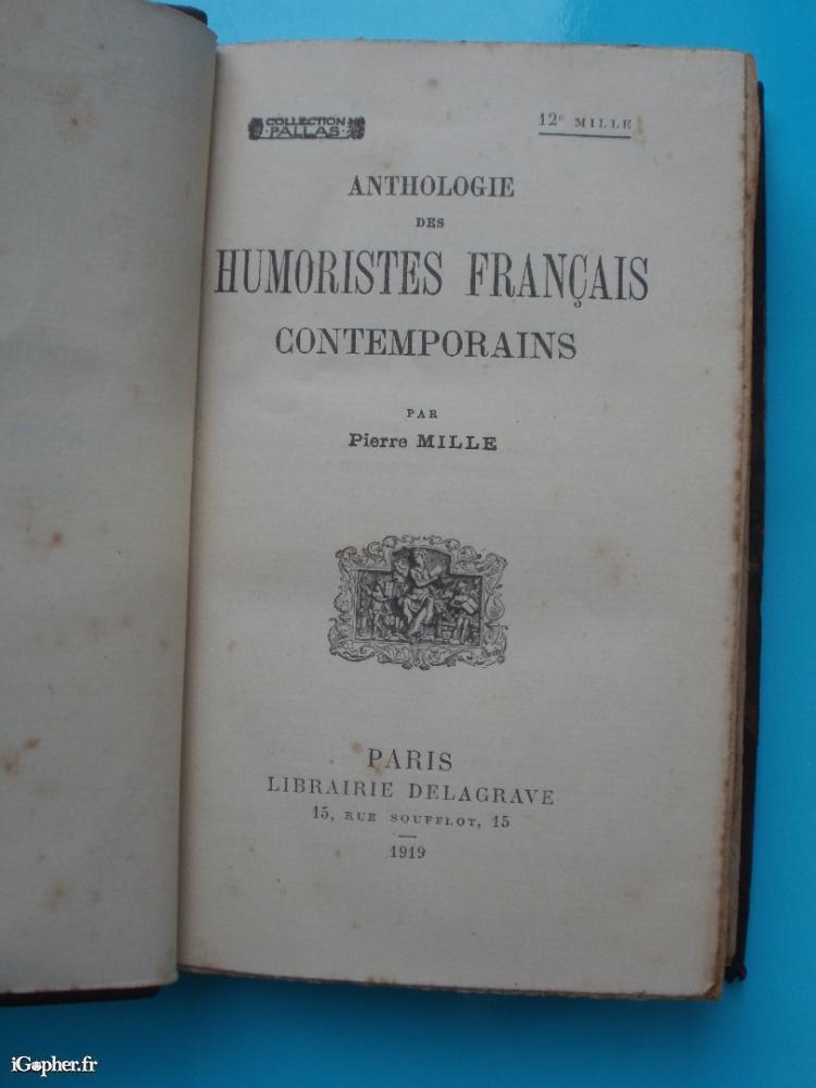 Livre écrit par Pierre MILLE, il titre : Anthologie des humoristes français contemporains. 12ème mille. Livre de 477 pages édité par la Librairie DELAGRAVE en 1919.