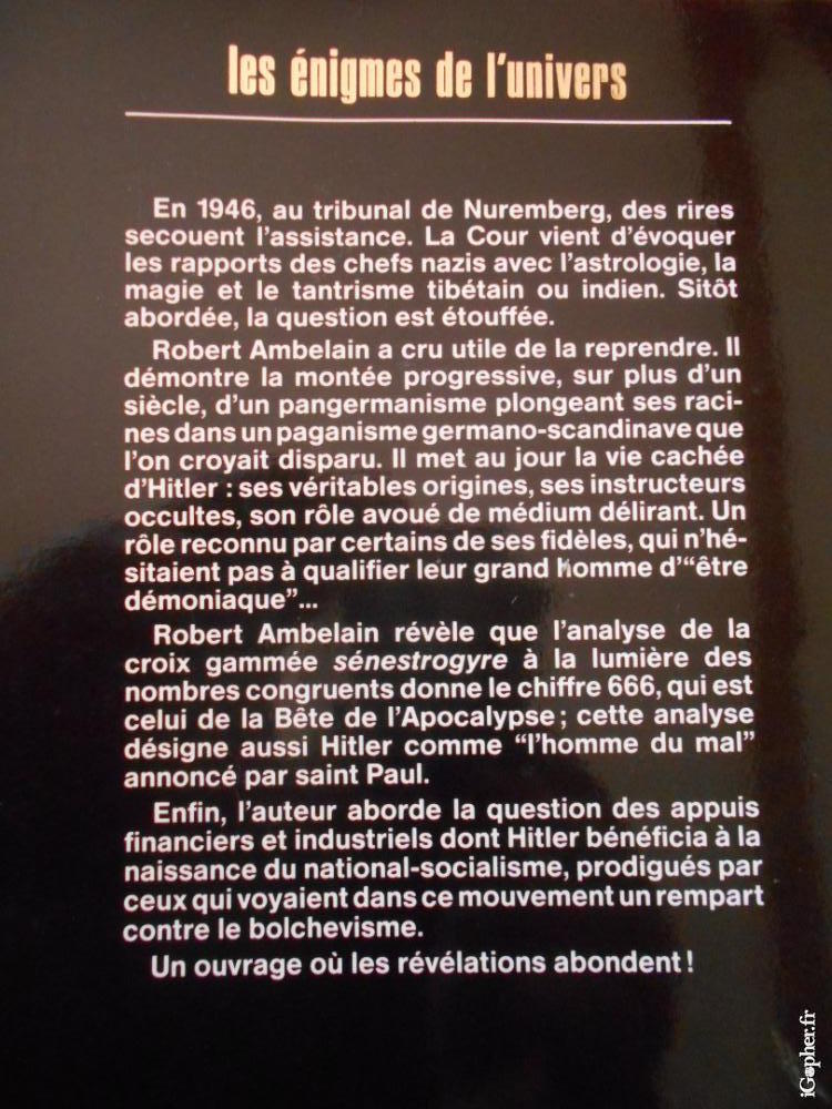 Robert Ambelain a cru utile de la reprendre. Il démontre la montée progressive, sur plus d'un siècle, d'un pangermanisme plongeant ses racines dans un paganisme germano-scandinave que l'on croyait disparu. Il met au jour la vie cachée d'Hitler : ses véritables origines, ses instructeurs occultes, son rôle avoué de médium délirant. Un rôle reconnu par certains de ses fidèles, qui n'hésitaient pas à qualifier leur grand homme d'être démoniaque...