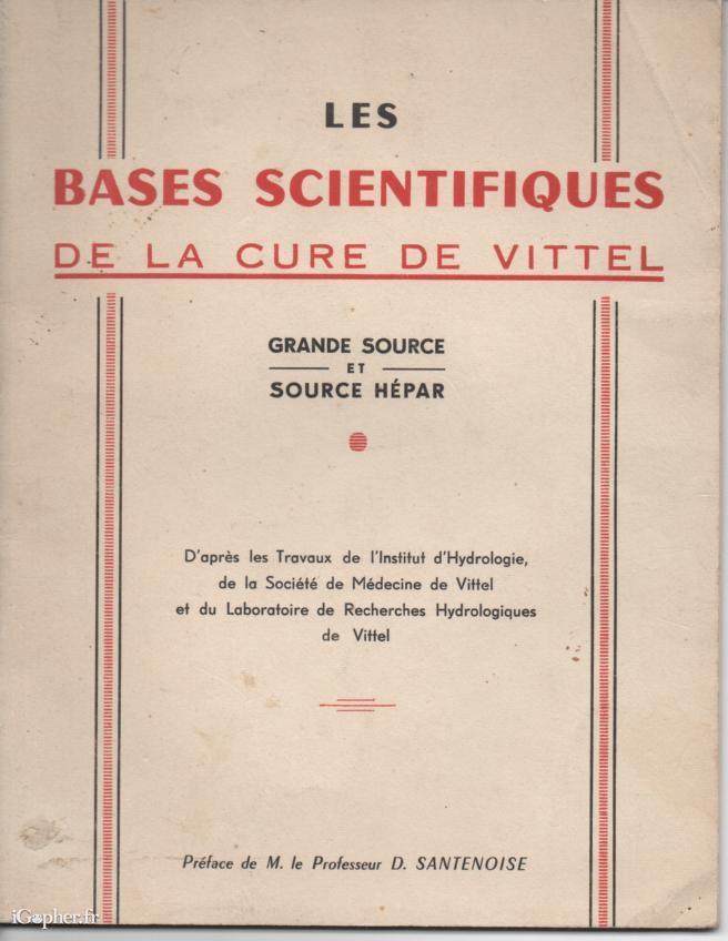 Cet ouvrage titre : "Bases scientifiques de la cure de Vittel : Grande source et Source Hépar", d'après les travaux de l'Institut d'Hydrologie, de la Société de Médecine de Vittel et du laboratoire de Recherches hydroliques de Vittel.