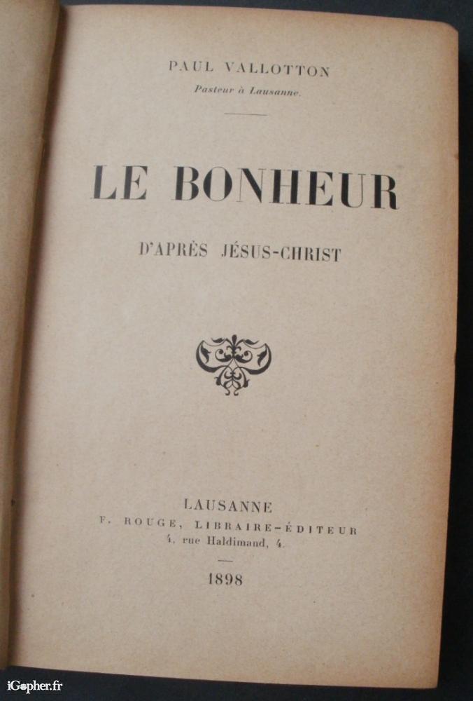 Livre relié de 231 pages écrit par Paul VALLOTTON. Il titre "Le bonheur d'après Jésus Christ", un ouvrage édité par F. ROUGE, libraire éditeur à Lausanne en 1898.