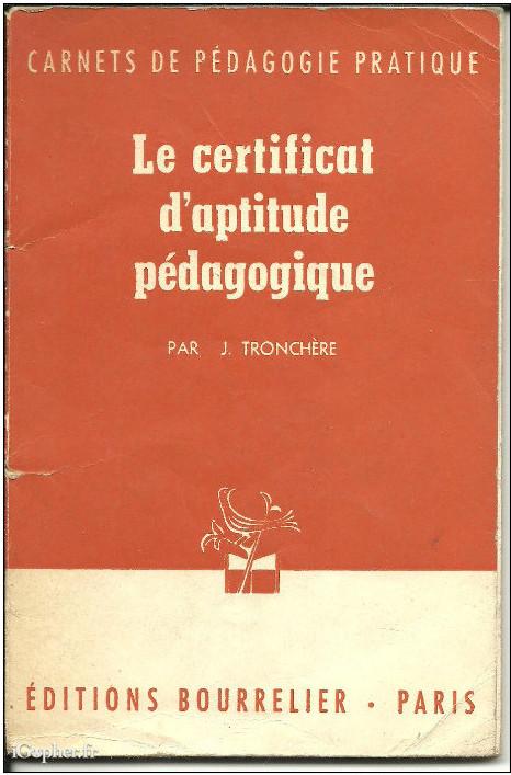 Un livre de 96 pages qui fait partie de la collection "Les Carnets de Pédahogie Pratique", il titre "Certificat d'Aptitude Pédagogique" et a été écrit par J. Tronchère.