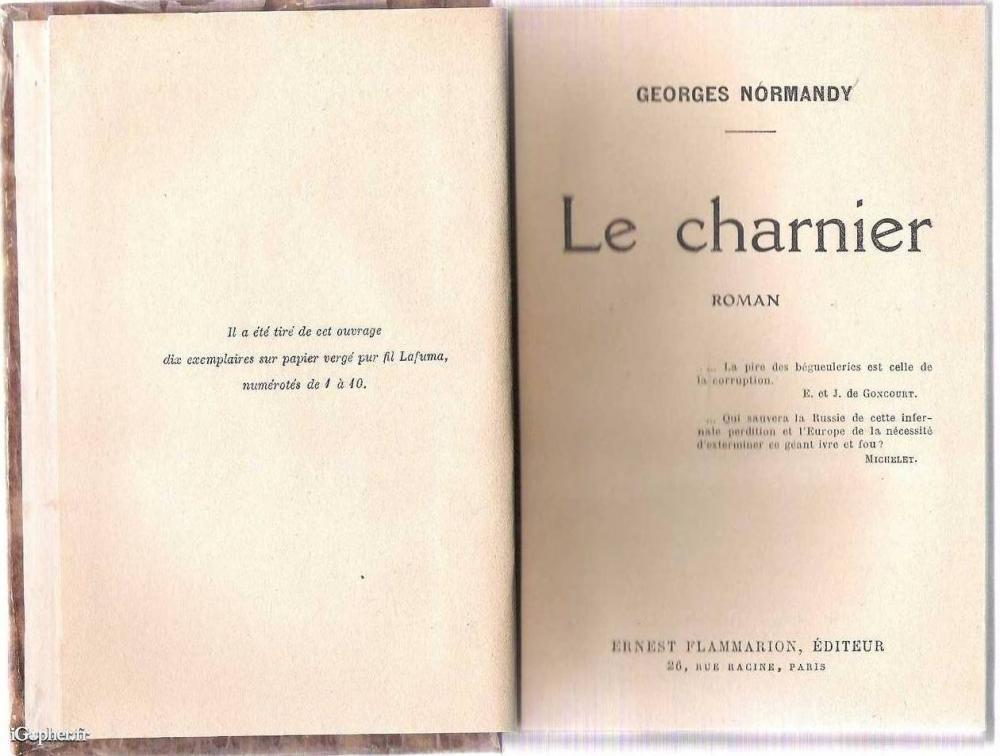 Ouvarge de éditions FLAMMARION publié en 1928. Il titre "Le charnier de Georges Normandy". Livre de 282 pages, inscriptions dorées sur la couverture.