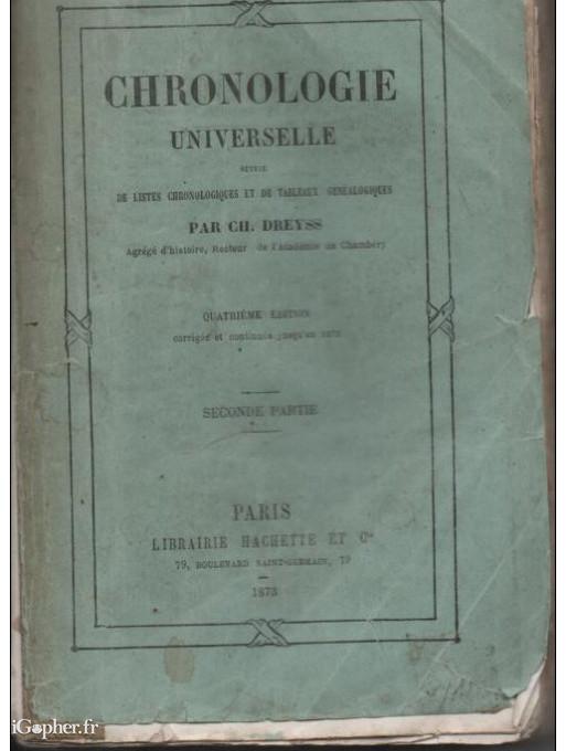 Cet ouvrage titre "CHRONOLOGIE UNIVERSELLE : Listes Chronologiques de Tableaux Généalogiques : Seconde partie". Un livre écrit par CH. DREYSS, Agrégé d'Histoire, Recteur de l'Académie de Chambéry.
