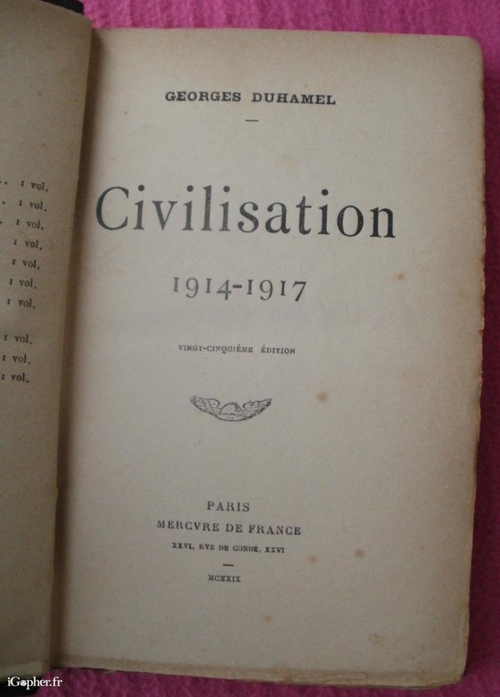 Un livre relié d'occasion, il a été écrit Georges DUHAMEL et titre : "Civilisation 1914 - 1917" (période de la Première Guerre Mondiale).