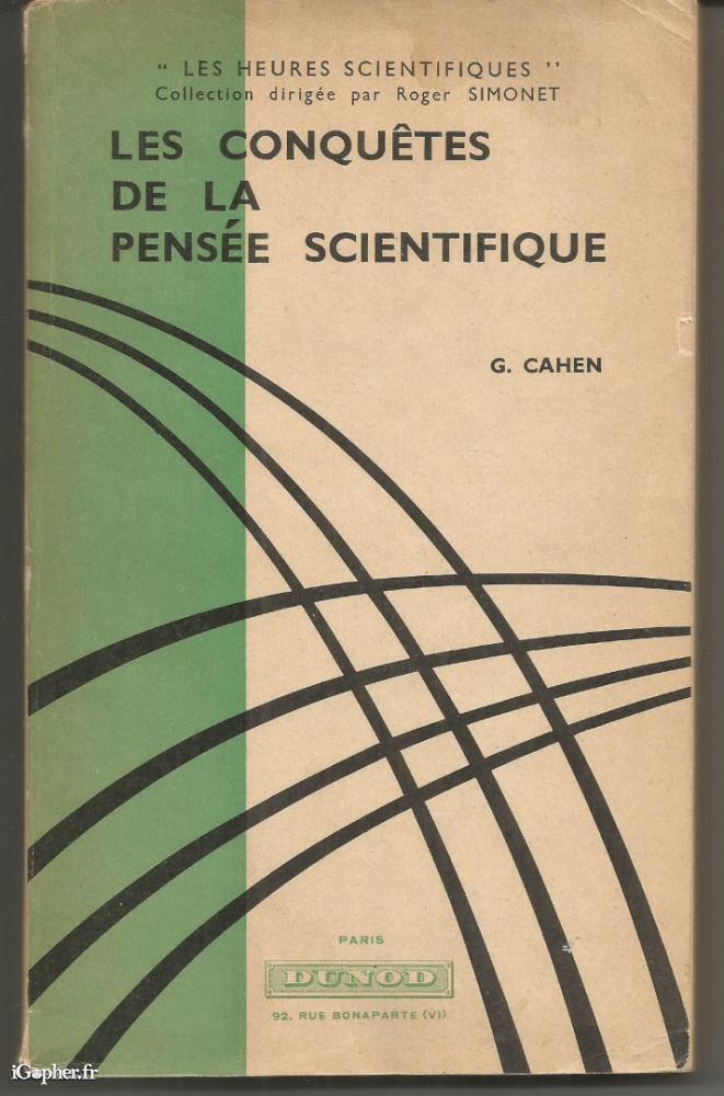Un livre de G CAHEN, il titre : Les conquêtes de la pensée scientifique. Ouvrage de la Collection "les heures scientifiques" dirigée par Roger Simonet.