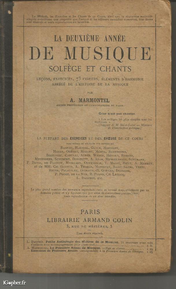 Un livre de A MARMONTEL, ancien professeur au concervatoire de Paris ; il titre "La deuxième année de musique Solfèges et Chants : leçons, exercices, 73 choeurs, éléments d'harmonie, abrégé de l'histoire de la musique".
