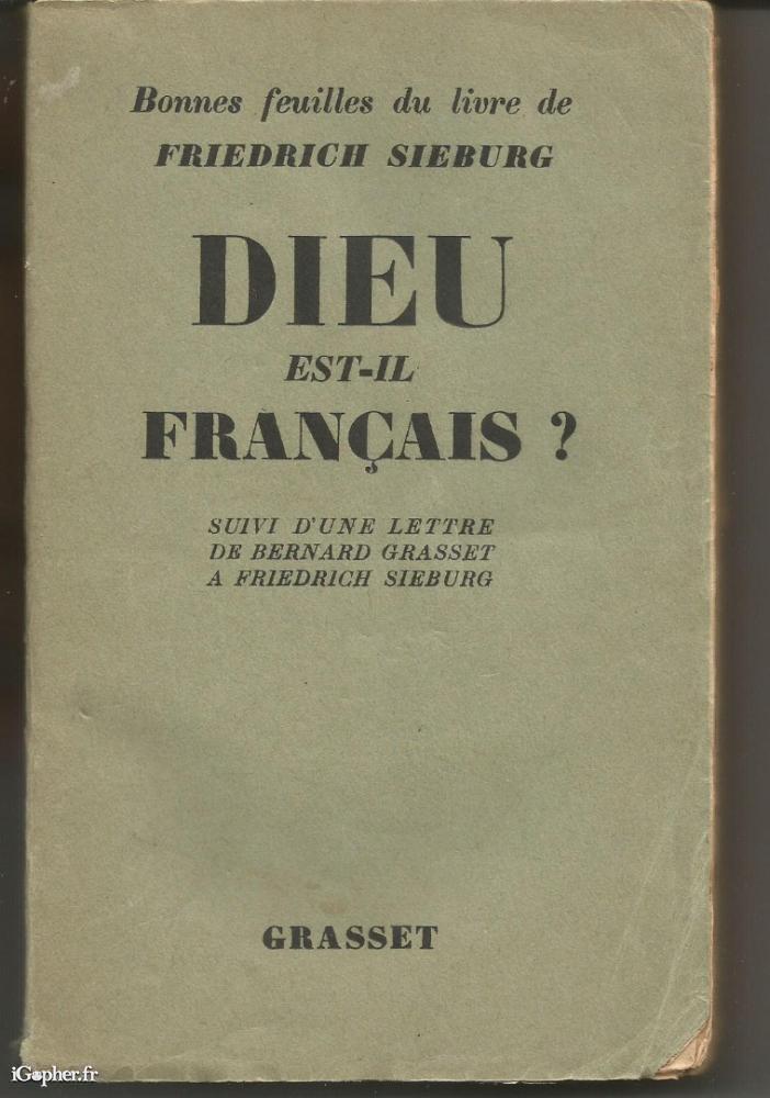 Un livre de Friedrich SIEBURG, il titre : "DIEU est-il français ?", traduit de l'allemand et suivi d'une lettre de Bernard Grasset à Friedrich Sieburg.