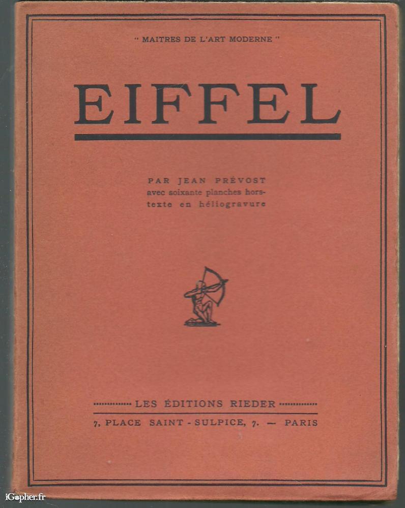 Le livre titre "EIFFEL" (de la "Tour Eiffel" à Paris, en France), il a été écrit par Jean PREVOST. Cet ouvrage comprend 60 planches hors texte en héliogravure.