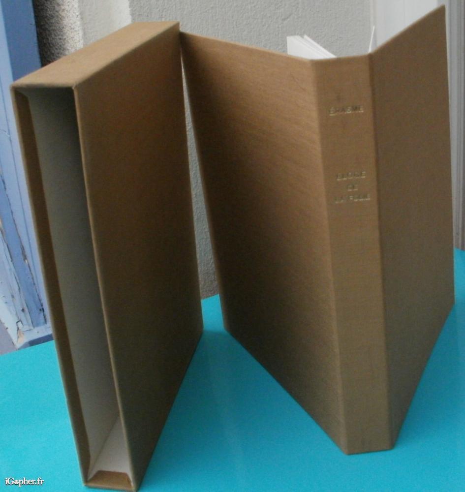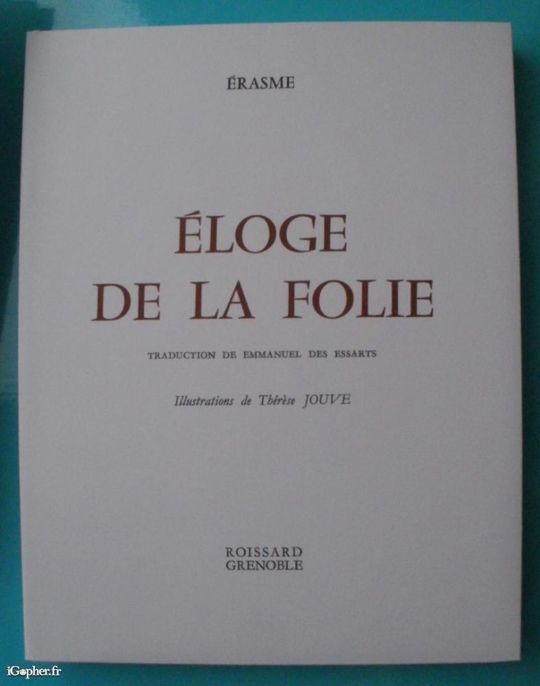 Un livre d'ERASME qui titre : Eloge de la folie. Sous emboitage. Traduction de Emmanuel des Essarts. Illustrations de Thérèse Jouve. Il est paru aux éditions ROISSARD à Grenoble.