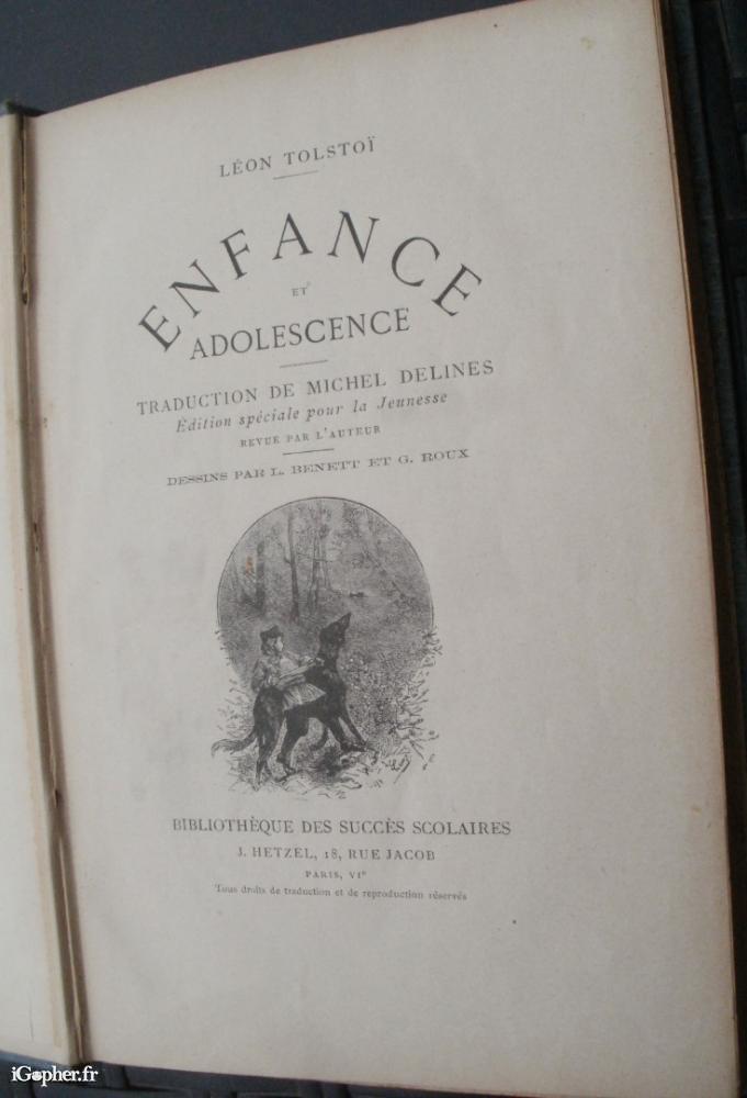 Un livre écrit par Léon TOLSTOI, il titre : Enfance et adolescence. Traduction de Michel Delines. Une édition spécale pour la jeunesse revue par l'auteur