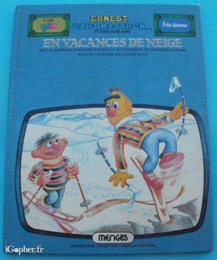 Ce livre pour enfants titre "Ernest, Bart, Macaron et tous leurs amis en vacances de neige". Texte de Bertrand Galimard Flavigny. Illustrations de Dominique Rocher. Mises en couleurs par Claude Bony.