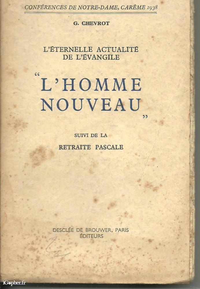 Livre de 316 pages écrit par G. CHEVROT, il titre : L'éternelle actualité de l'Evangile. Ouvrage paru aux éditions DESCLEE DE BROUWER en 1938.