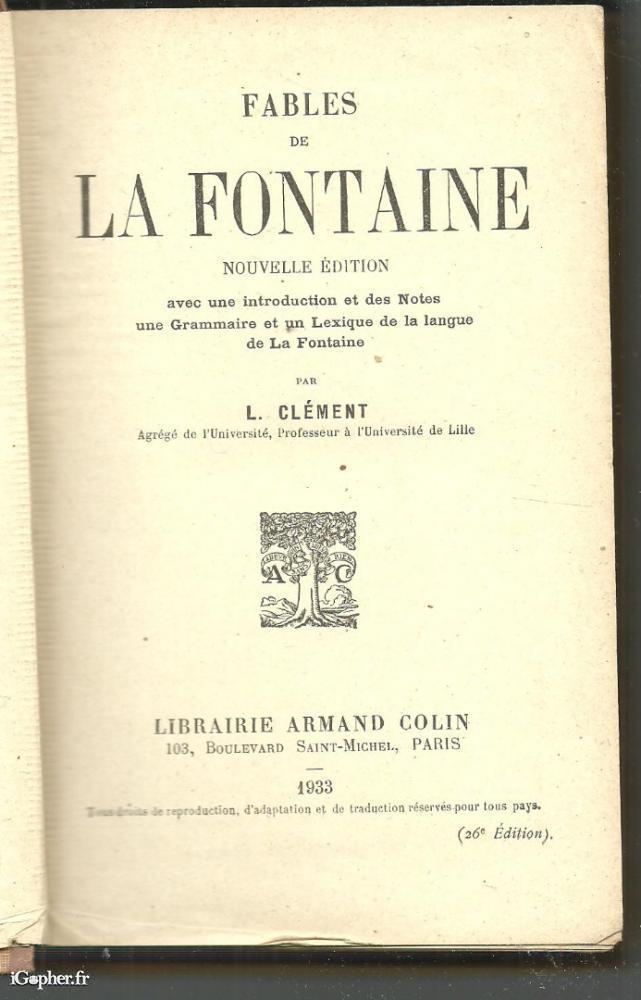 Un ouvrage de par L. CLEMENT, Agrégé de l'université, professeir à l'université de Lille. Le livre titre : "Fables de La Fontaine". C'est 26ème édition, avec une introduction et des notes, une grammaire et un lexique de la langue de LA FONTAINE.