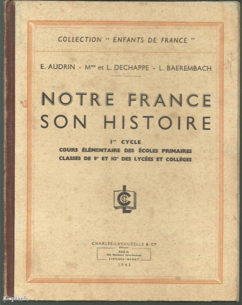 Ce livre fait partie de la collection "Enfants de France", il titre "Notre France son Histoire" et a été écrit par E. AUDRIN, L. DECHAPPE et L. BAEREMBACH