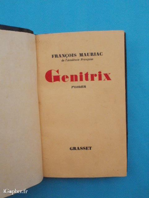 Livre relié de 220 pages édité aux éditions Grasset en 1940. Cet ouvrage de François MAURIAC titre : GENETRIX. Le dos de la couverture et les rebords sont en cuir.