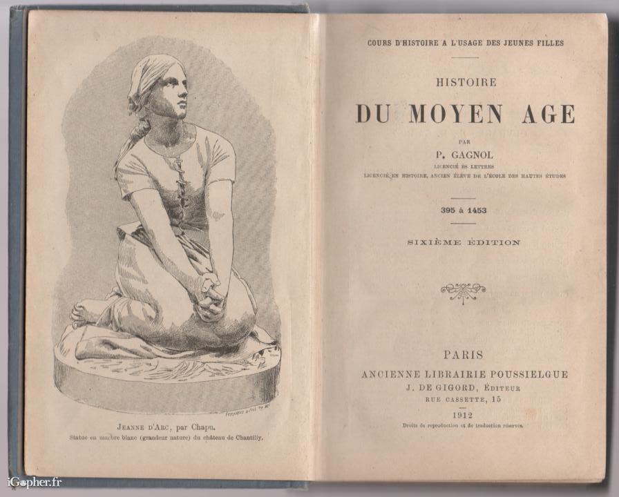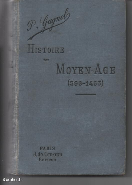 Cours d'histoire à l'usage des jeunes filles, ce livre titre "HISTOIRE DU MOYEN-AGE (395 à 1453)" par P. GAGNOL, licencié es lettres, licencié en histoire, et ancien élève de l'école des Hautes Etudes.