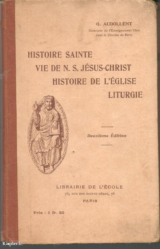 Ouvrage de l'auteur G. AUDOLLENT, Directeur de l'enseignement libre dans le Diocèse de Paris. Son livre titre : "Histoire Sainte : Vie de N.S Jésus-Christ, Histoire de l'Eglise, Liturgie".