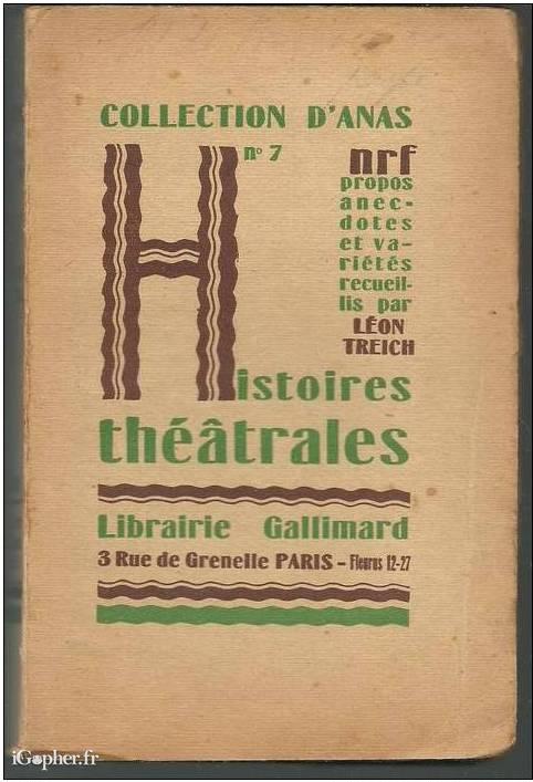 Propos anectotes et variétés recueillis par Léon TREICH, le livre titre "Histoires théâtrales" et a été publié à la Librairie GALLIMARD. C'est une édition de 1925 qui comprend 188 pages.
