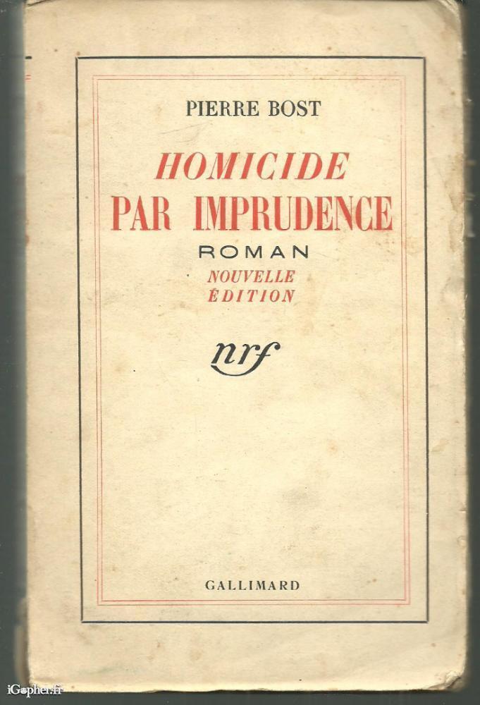 Roman de Pierre BOST : "homicide par imprudence". Livre de 216 pages publié chez Gallimard en 1936.