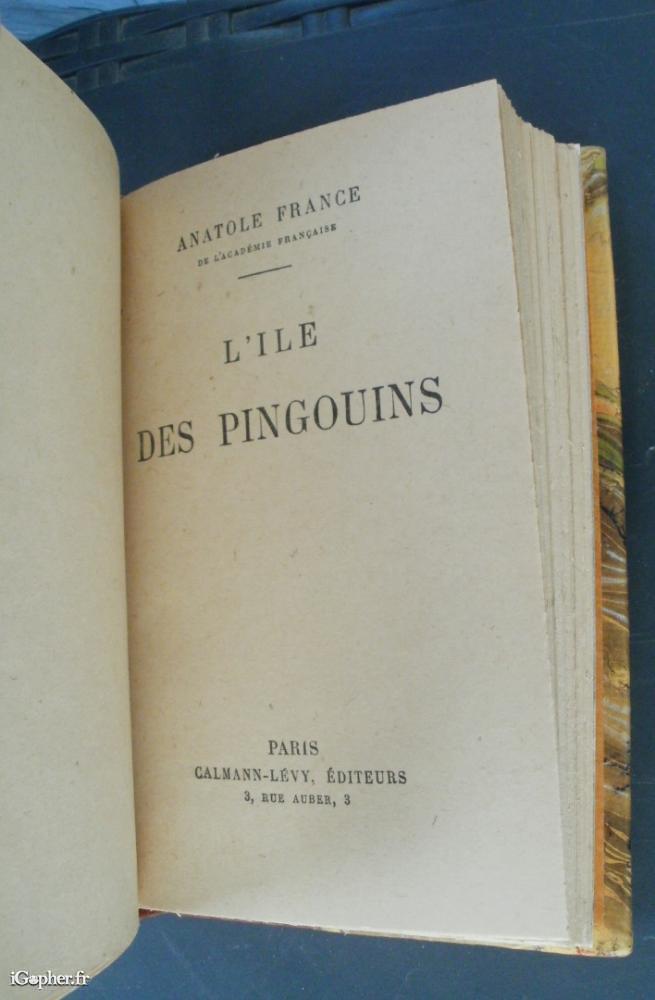 Ouvragde écrit par Anatole FRANCE, il titre "L'ile des Pinguoins" et fait partie de la Collection "le ZODIAQUE". Ce livre d'un total de 288 pages est paru aux éditions CALMANN LEVY en 1947.