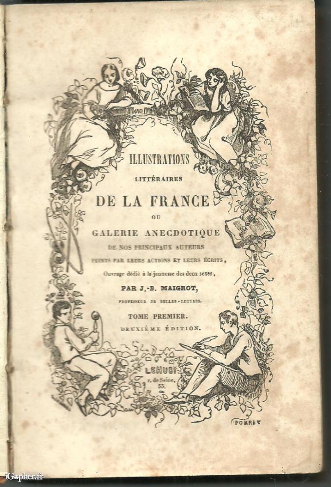 Un ouvrage dnt le titre complet est : Illustrations littéraires de la France ou galerie anecdotique de nos principaux auteurs peints par leurs actions et leurs écrits. Ouvrage dédié à la jeunesse des deux sexes par J. B. MAIGROT, Professeur de belles lettres.