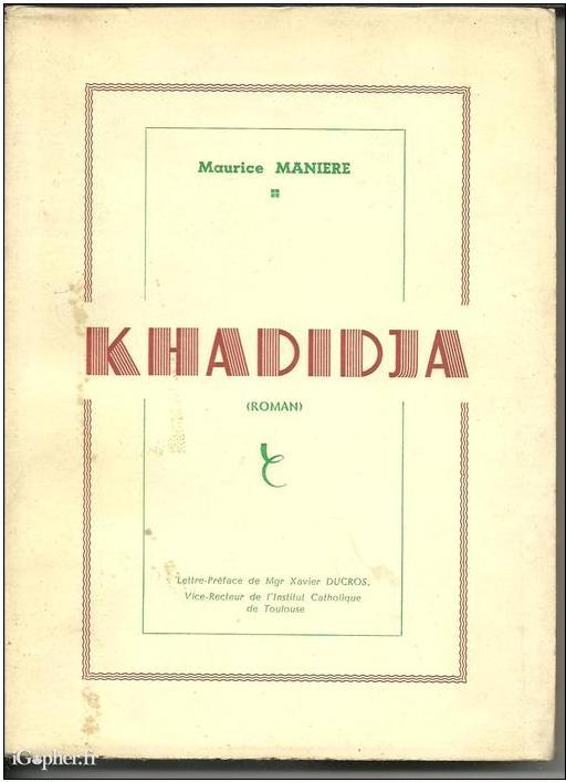 Livre de 218 pages édité en 1962, il a été écrit par Maurice MANIERE et titre : Khadidja. Lettre préface de Mgr Xavier DUCROS, Vice Récteur de l'Institut Catholique de Toulouse.