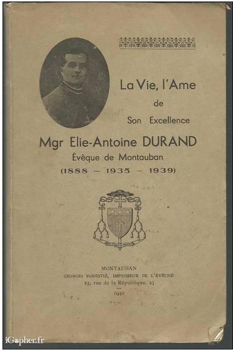 Le livre de Mgr Elie-Antoine DURAND, évêque de Montauban (1888 - 1935 - 1939), intuitulé : "La vie, l'âme de son excellence".