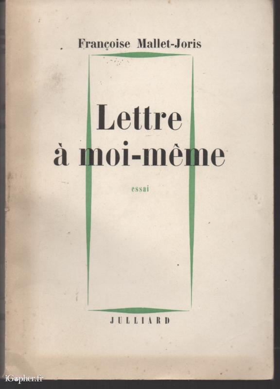 Livre de 238 pages écrit par Françoise MALLET-JORIS, qui titre : Lettre à moi même. Essai paru aux éditions JULLIARD en 1963.
