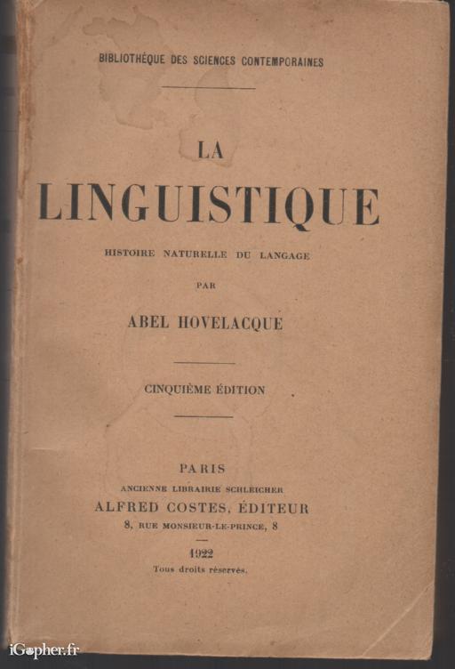 Un ouvrage de Abel HOVELACQUE, faisant partie de la Collection "bibliothèque des sciences contemporaines". Ce livre de 448 pages titre "La linguistique, histoire naturelle de langage". Il a été édité en 1922 aux éditions Alfred COSTES, ancienne librairie SCHLEICHER.