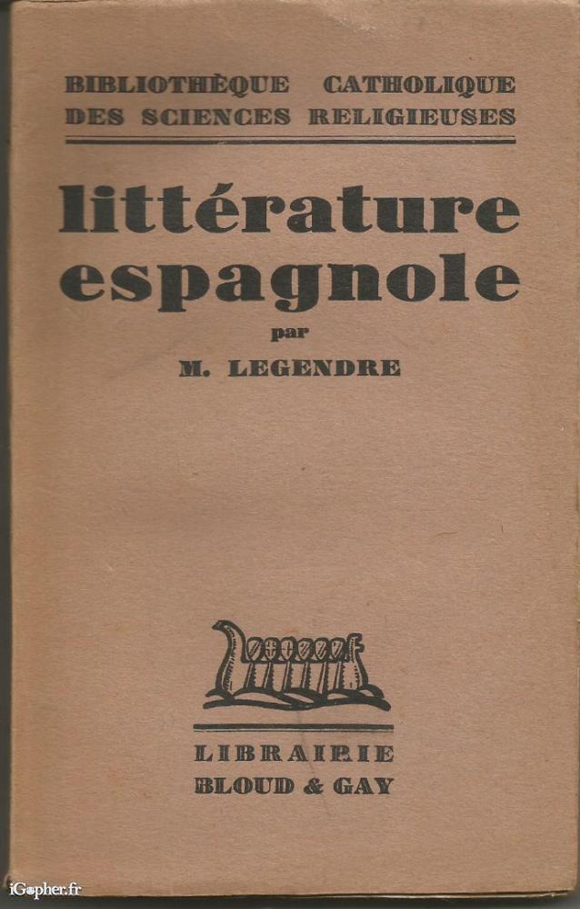 Ouvrage de M. LEGENDRE. Il titre "Littérature espagnole" et fait partie de la Collection "Bibliothèque Catholique des sciences religieuses". Livre de 167 pages + table des matières paru aux éditions BLOUD ET GAY en 1930.